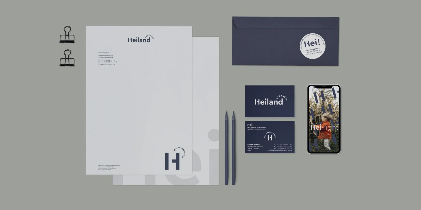 Die Primärfarbe, ein zeitloses Dunkelblau, strahlt Seriosität, Ruhe und Vertrauen aus. Eine authentische, ruhige Bildwelt unterstreicht die persönliche und kompetente Ausrichtung der Apotheke. Der Claim „Hei“ wird kreativ in Wortspielen eingesetzt und bringt die Marke auf sympathische Weise zum Ausdruck.