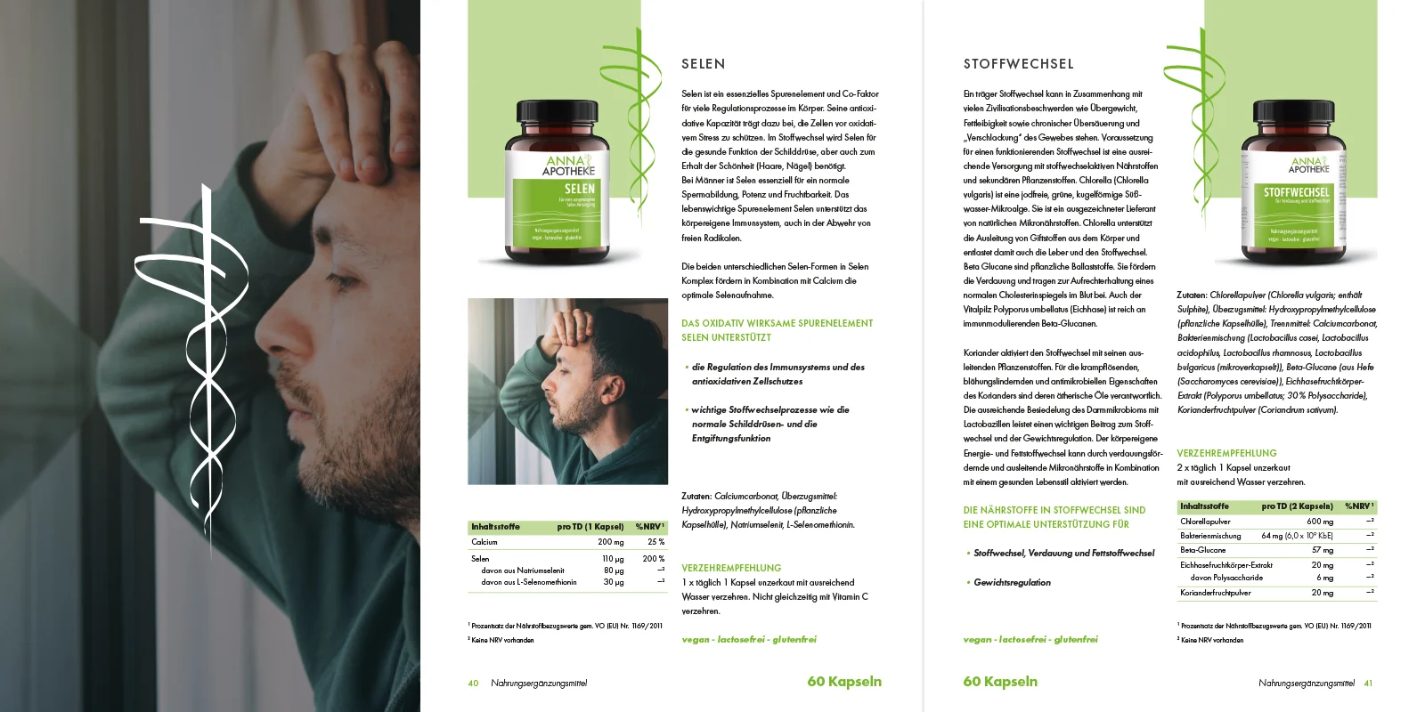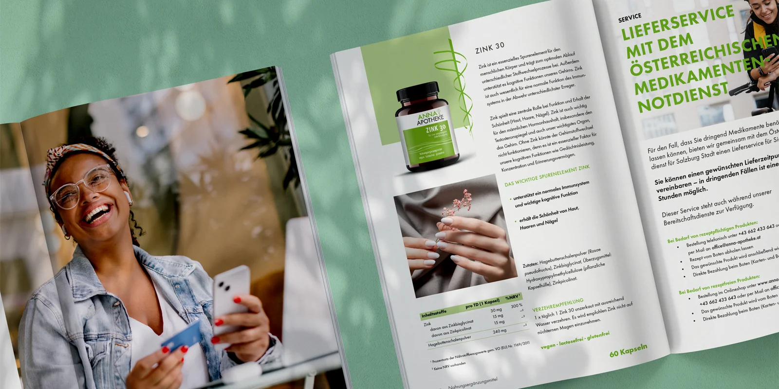 Für eine Salzburger Apotheke wurde ein umfassender Produktkatalog realisiert, der das gesamte Sortiment der hauseigenen Marken präsentiert. Inhalte unterschiedlicher Eigenmarken-Anbieter wurden dabei harmonisch zusammengeführt und in ein einheitliches, hochwertiges Layout überführt.