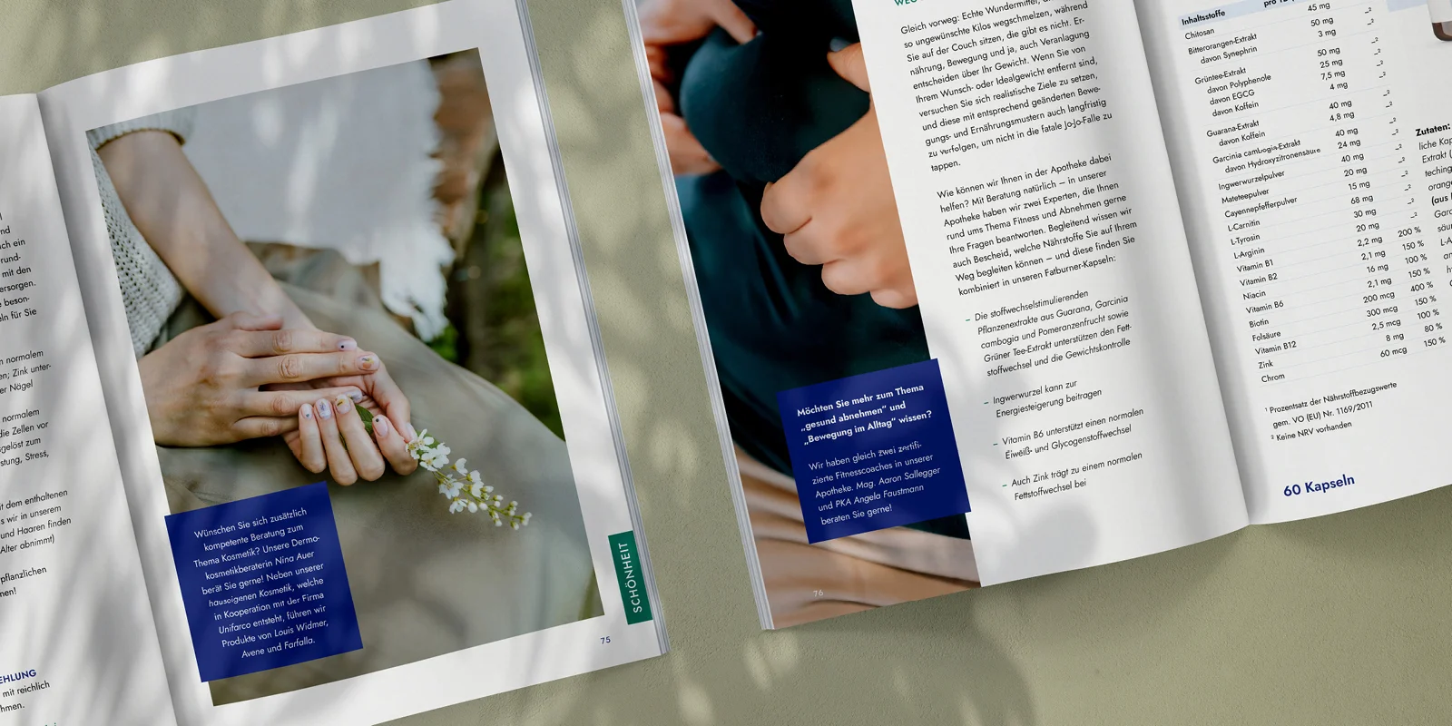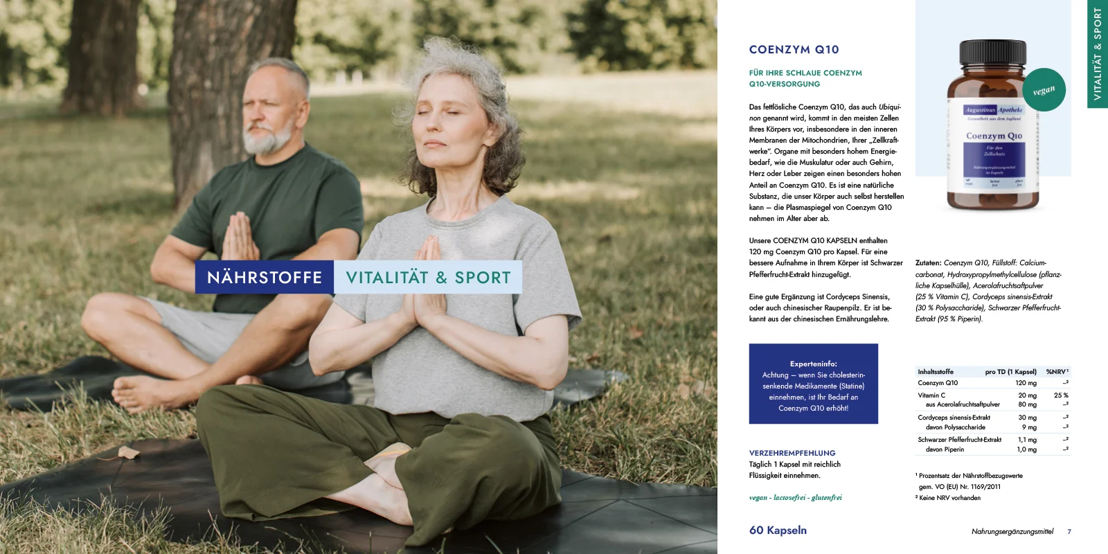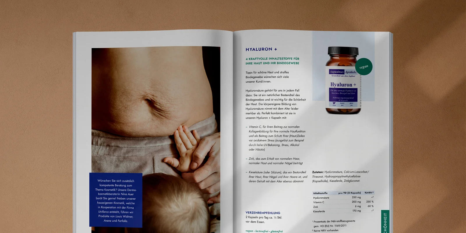Der Produktkatalog umfasst mehr als 50 Produkte aus dem Eigenmarkensortiment der Augustinus Apotheke. Die Inhalte unterschiedlicher Eigenmarken-Anbieter wurden vereinheitlicht und in einem stimmigen Gesamtkonzept vereint. Die Untergliederung erfolgt übersichtlich nach Indikation. Mit hervorgehobenen Infoboxen erhält der Leser wertvolle zusätzliche Tipps aus der Apotheke.